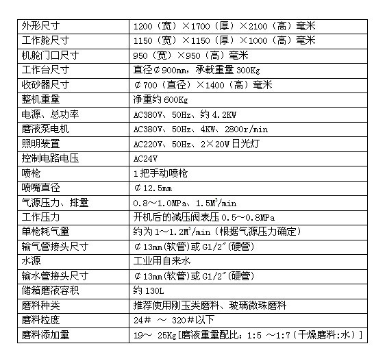 本机由主机舱、旋转工作台、砂水循环系统、喷枪砂路系统、气路系统、废旧磨料收集系统、电器控制系统等部分组成。(主机体由3mm**钢板制造,表面喷塑)